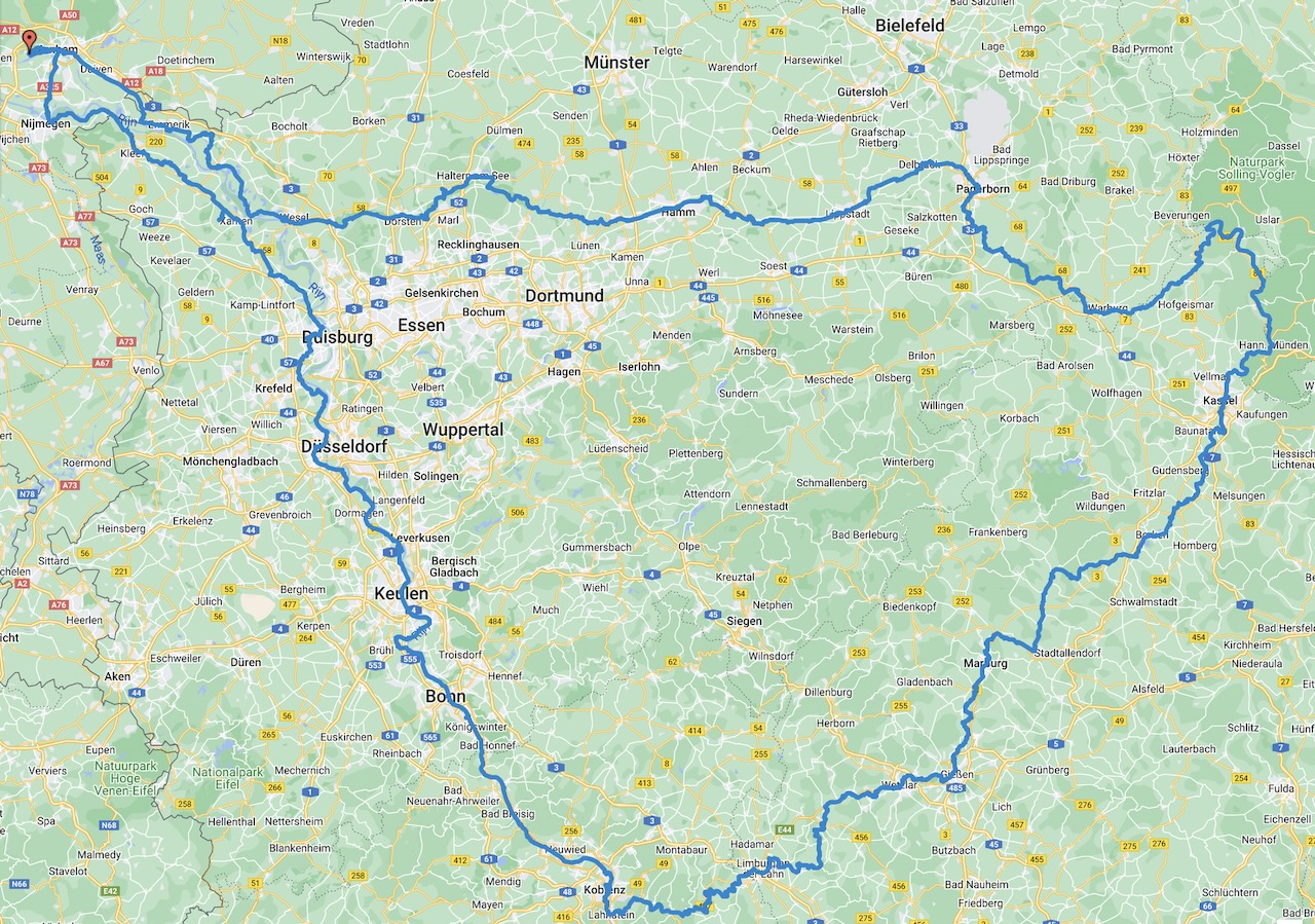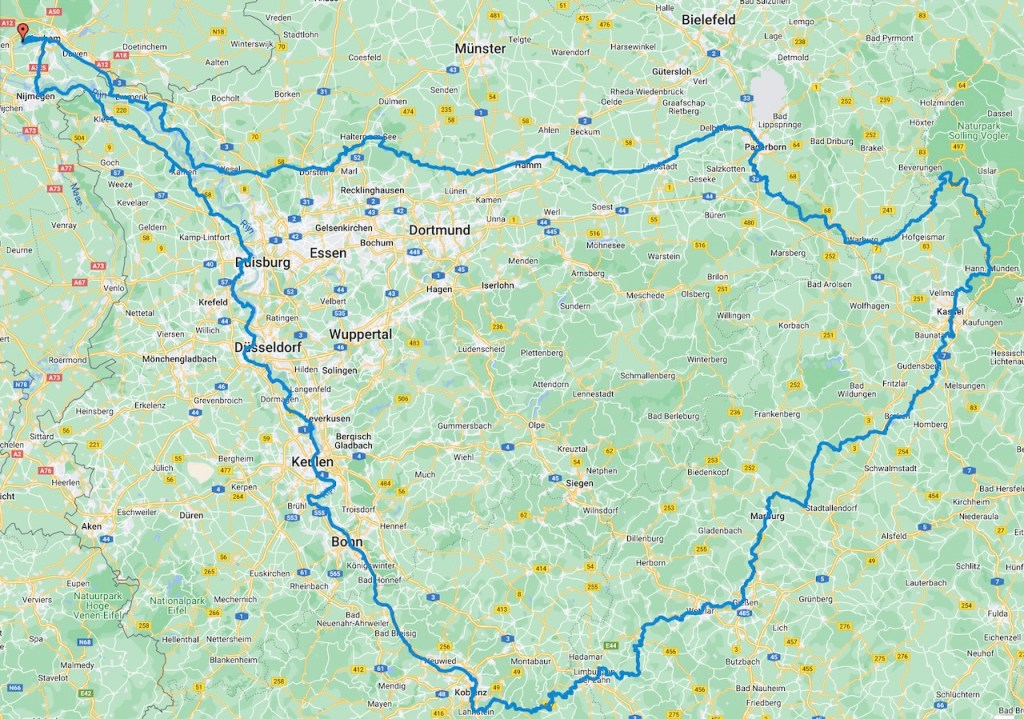 Van 22 juni tot en met 5 juli maakten we een fietsreis vanuit Nederland langs achtereenvolgens de Rijn, Lahn, Fulda, Weser, Diemel en Lippe. Een reis van in totaal 1169 kilometer.